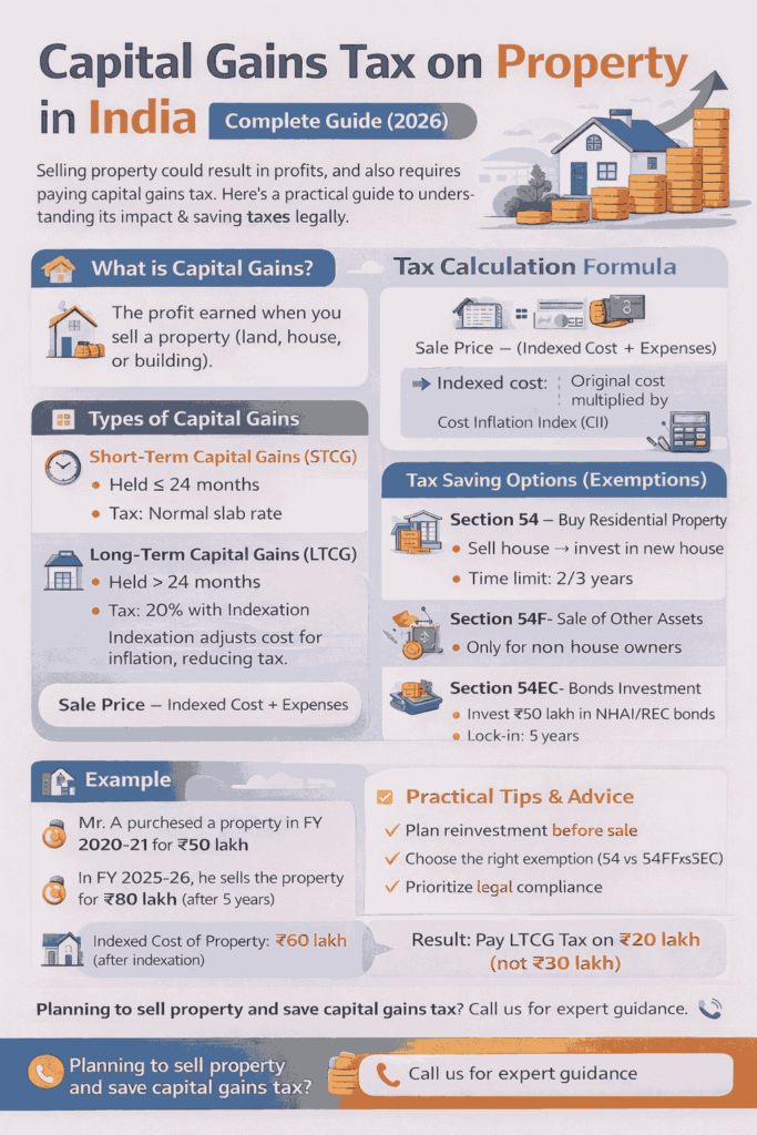When you sell a property (land, house, or building) at a profit, the gain is called capital gain and is taxable under the Income Tax Act